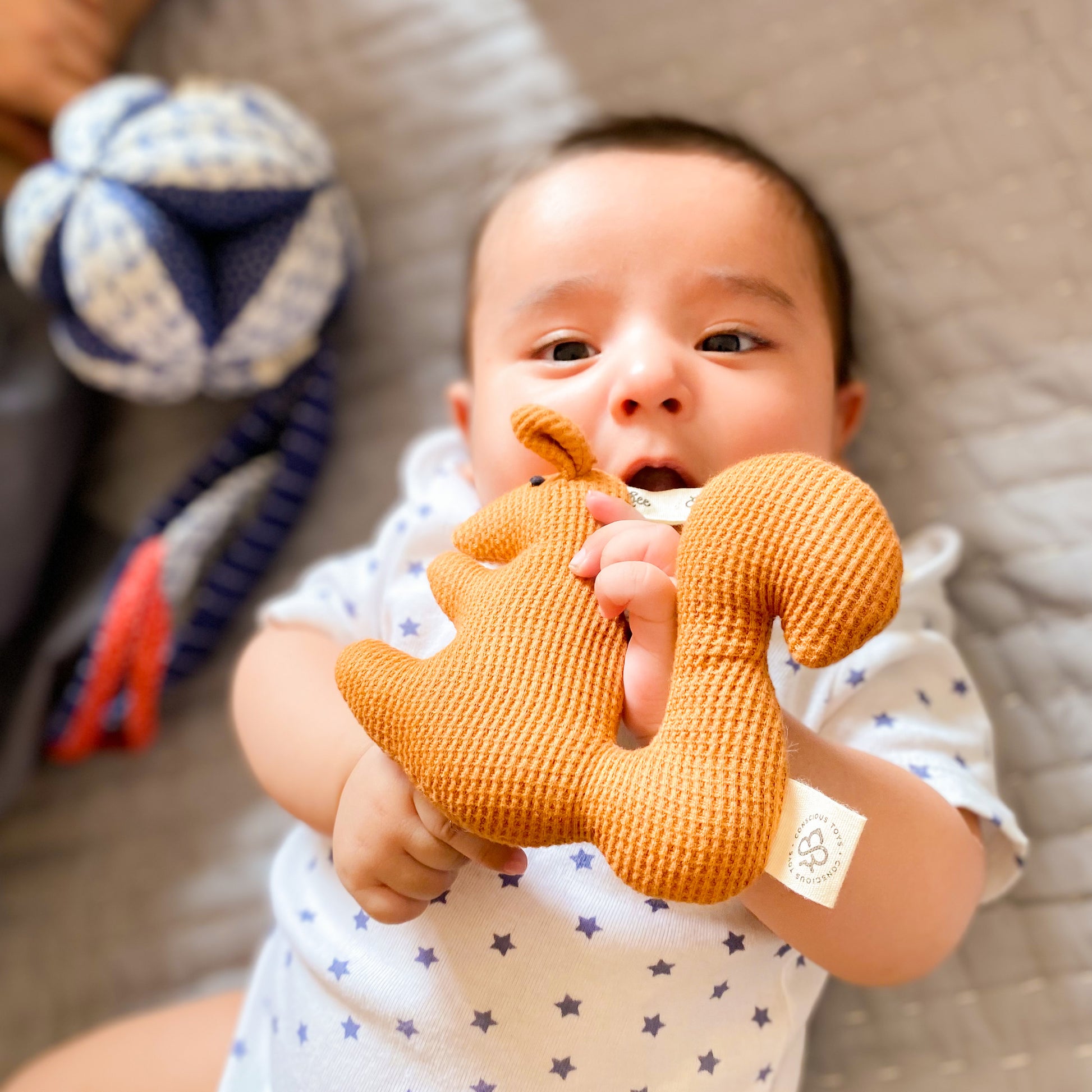 - Child follows the sound they produce and follow the path with their eyes, as well as giving them a sense of discovery as they try to grab and hold the rattle.